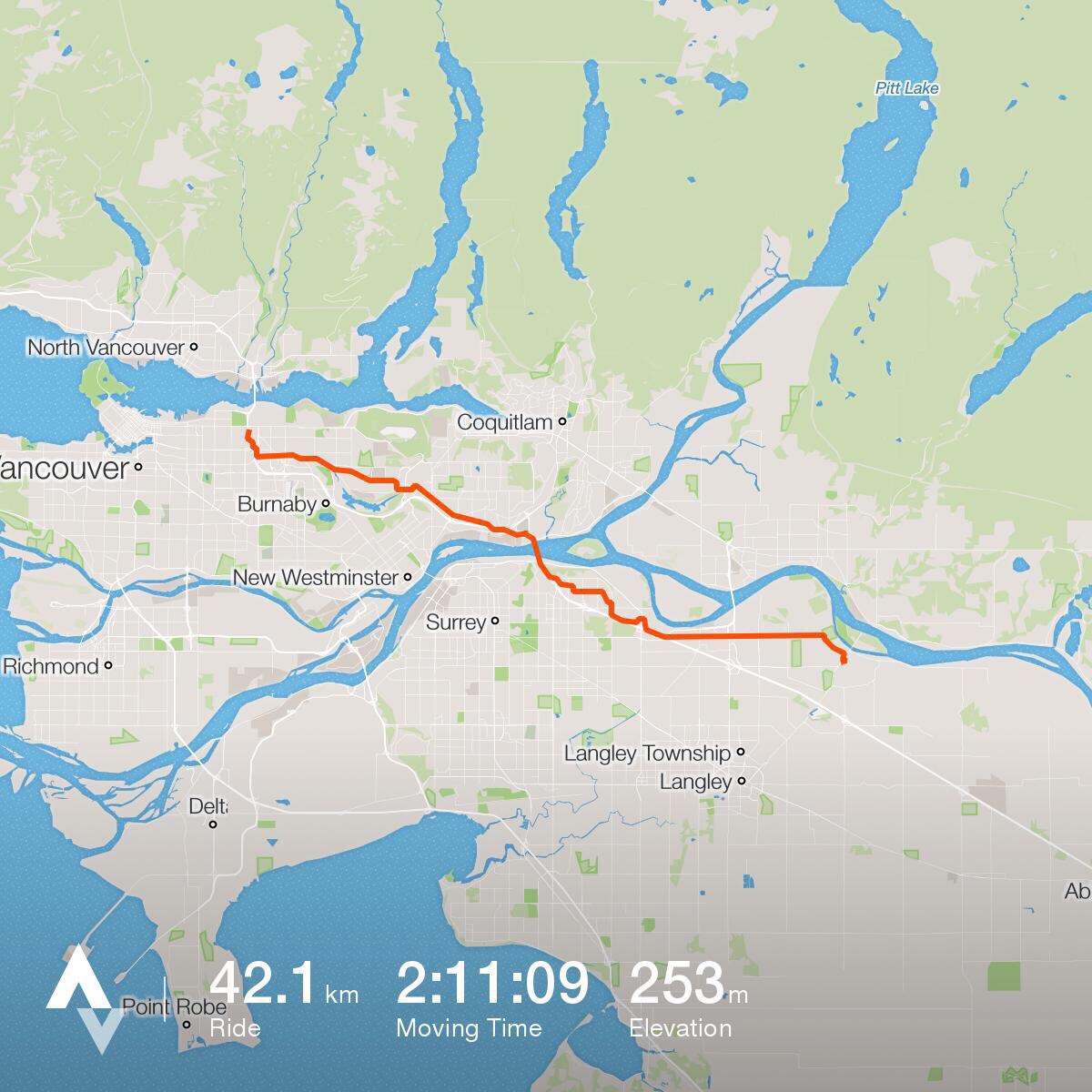 An ideal day for riding – about 12c, sunny, and not windy. Rode solo from Fort Langley back to my home. Slightly modified route through Burnaby along the “Lakes” and “Frances/Union” bike routes instead of Lougheed, which was quieter and more peaceful.