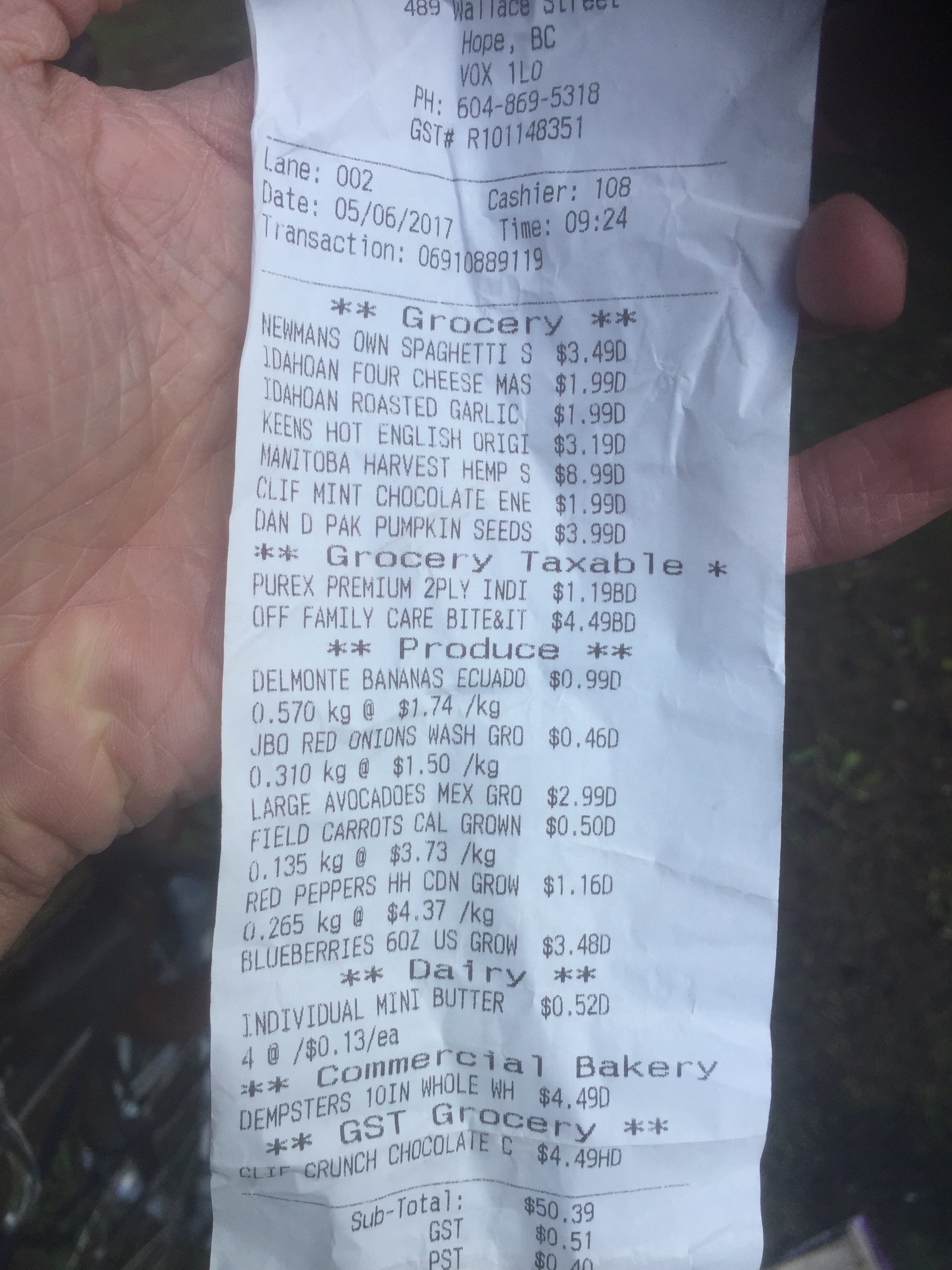 Mostly a prep day in Hope – breakfast, groceries, organizing, and getting advice from the Visitor Centre. While Hope’s Buy-Low Foods has no bulk section, I was able to stock up on the goods: