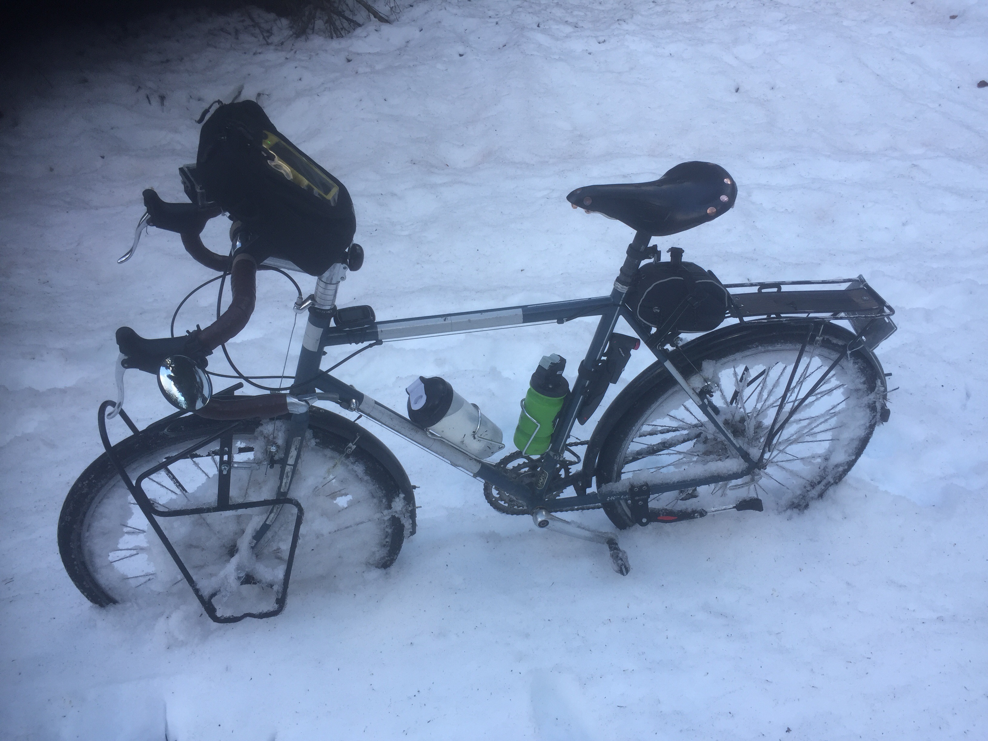 Met a couple ATVers who had to turn back because the trail was blocked by snow banks. Great thing about cycling is you can push your bike through! I told the ATVers they should shed a couple wheels 😉