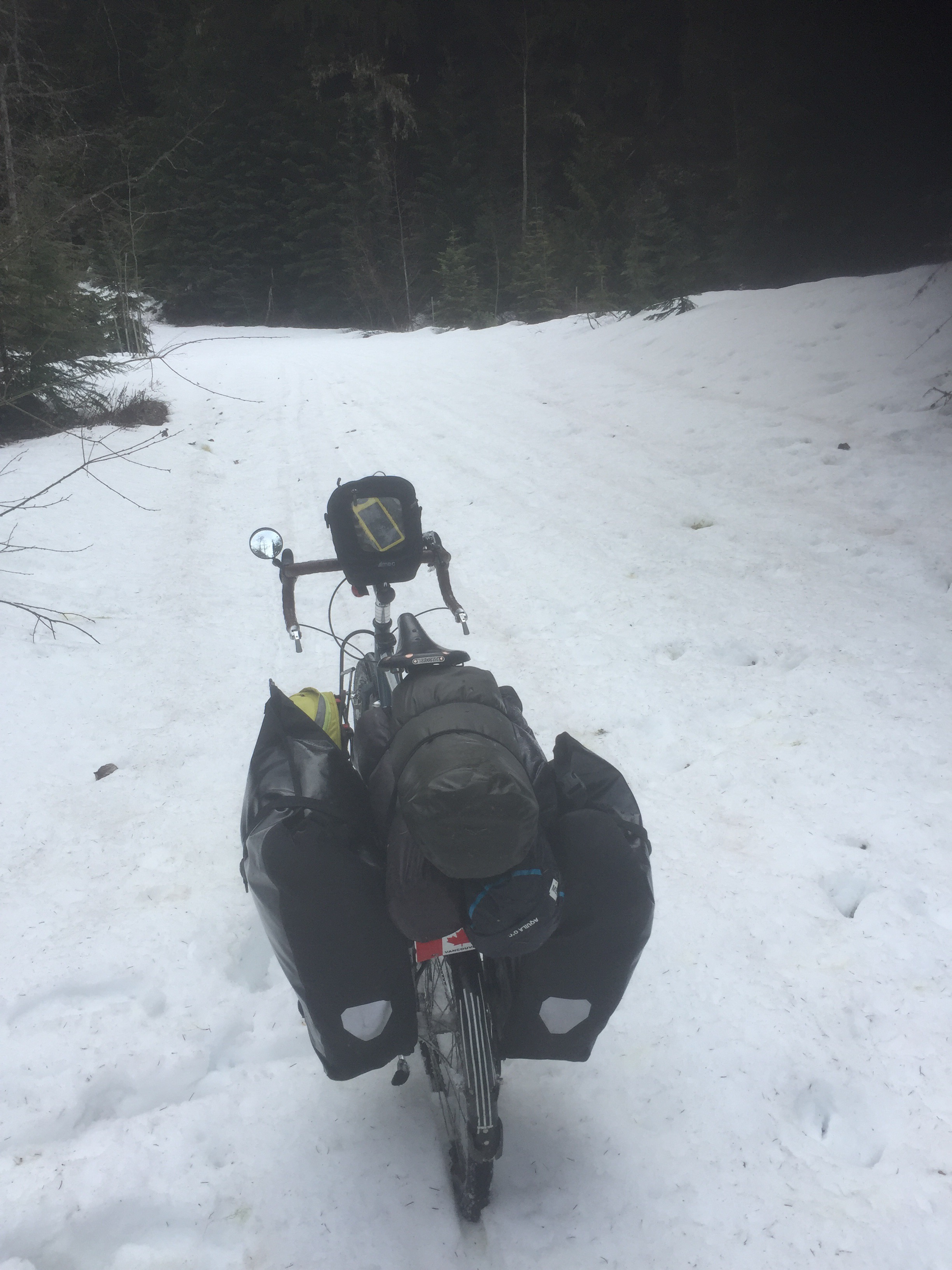 Turns out those snow banks were the start of a 2-day grind primarily pushing my bike and gear through snow. Several long snowed over sections where I decided to unpack my bike and split up the load into two or three trips. If you’re looking for a challenging full-body and cardio workout, I highly recommend pushing a bike with 61 pounds of luggage through the Coq River Trail before the snow melts.