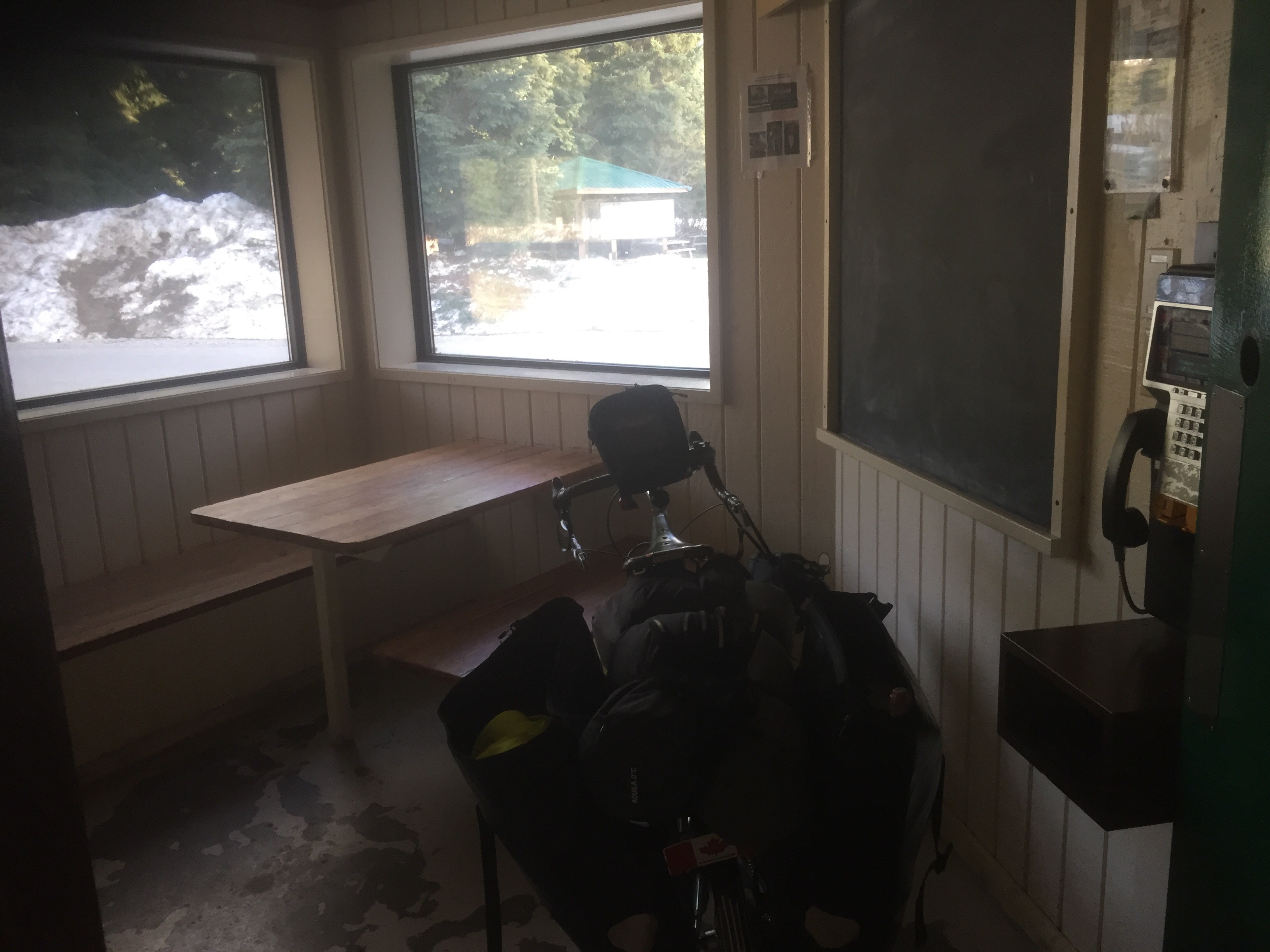 May 8th around 3pm was my return to civilization, where I pushed my bike through about a 2km stretch of snow to a road just off the coq highway. Met a road worker there so kind he handed me a bag of sausages and insisted I take them! He then pointed me up the road to Britton Creek Rest Area, where I spent the night recharging the batteries, as well as my own.
