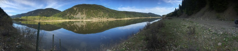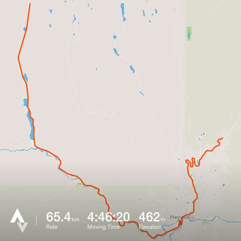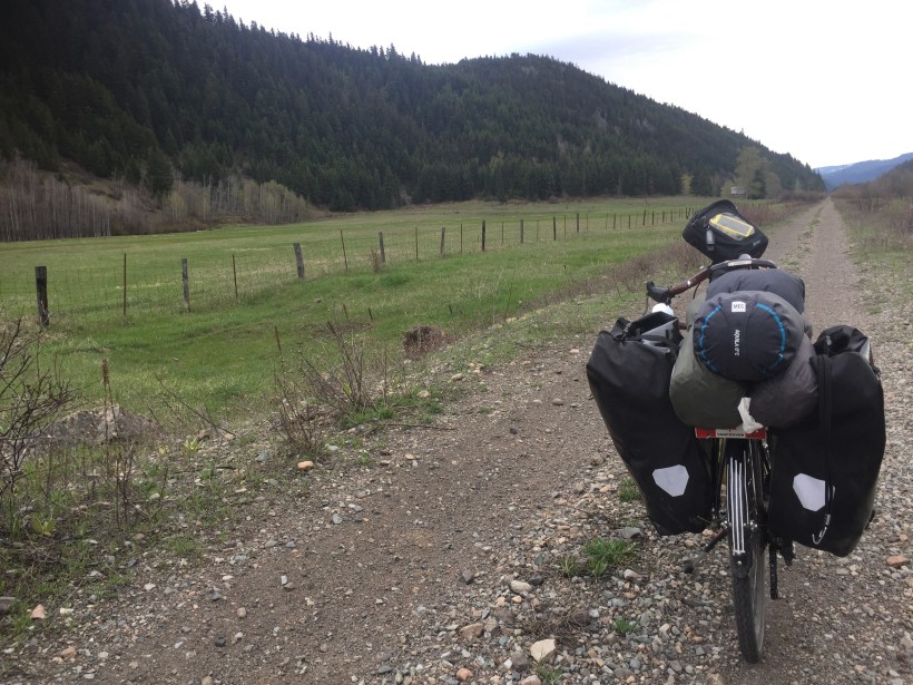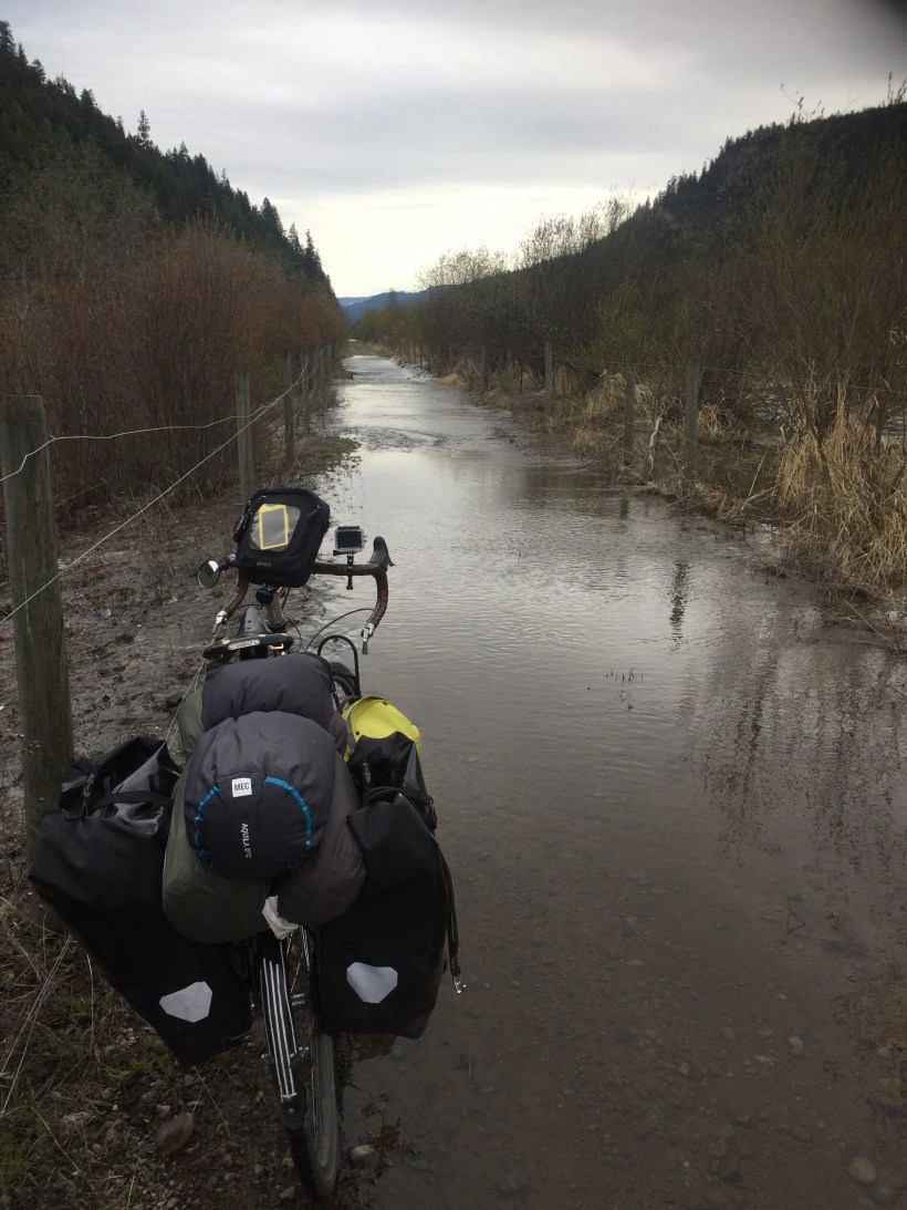 May 9th started with a gentle cruise down the Coquihalla Highway – yes, downhill since I started at the Coq Summit. I then veered off Eastbound through Brookmere, finishing the day with two unexpected challenges. First, pushing my bike through about 20 metres of overflown water on the trail – a breeze compared to my Coquihalla River Trail excursion, and the water on my feet was actually refreshing!