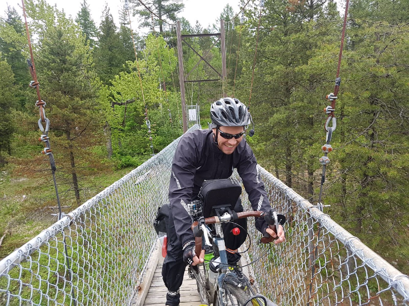 Laughing at myself crashing into the side fencing on this very narrow bridge!
