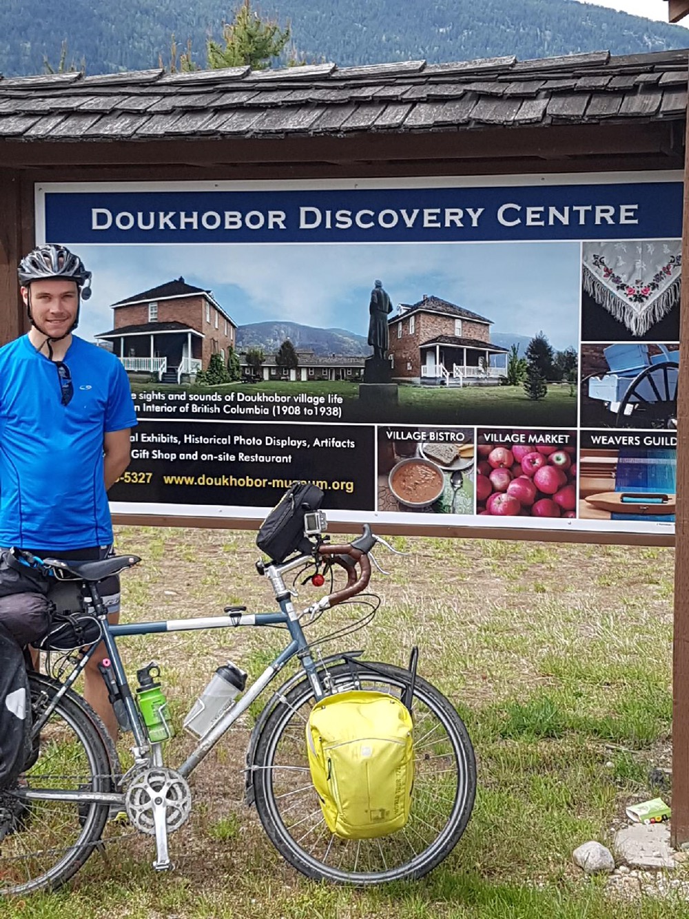 The next morning we cycled around Castlegar together, stopped at the Doukhobor museum, and continued to Thrum’s Market on my way to Nelson. That was my chance to treat him to Borscht soup for lunch and some baked goods to take home!