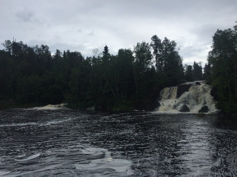 Barb pointed to her husband Geoff, who’d just parked their SUV – Support and Utility Vehicle in this case! She uses panniers mostly to look the part, while Geoff carries most gear in their Volvo. We exchanged stories from our similar yet different journeys, then headed to Atikokan’s Little Falls as the rain strengthened.