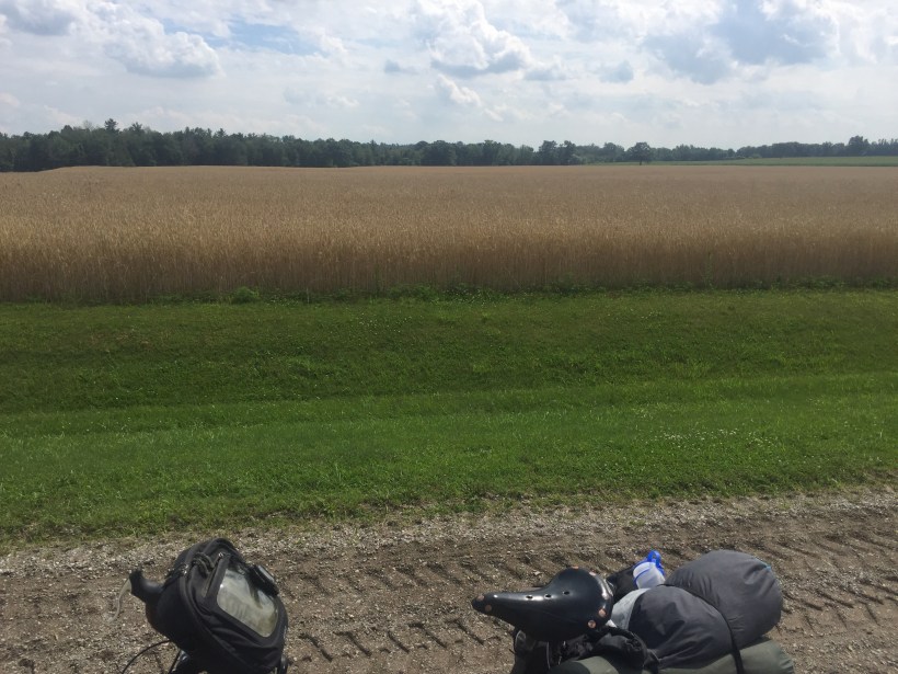 After bidding farewell to my Windsor hosts, I doubled back Eastbound on Tuesday, riding along Lake St. Clair and between corn and wheat fields with an eye on Ilderton. Stopped at a beach on Lake St. Clair, I met a couple guys barbecuing at their summer cottage. Their generosity came in layers, a “foot in door technique” if you will. First we exchanged stories, then they filled me up on water and I used their washroom. By the time I left I was far from empty-handed – a can of chili, fresh veggies, and a couple extra burger patties. As I discovered later that night, hamburger meat goes okay with spaghetti noodles and powdered Alfredo sauce!