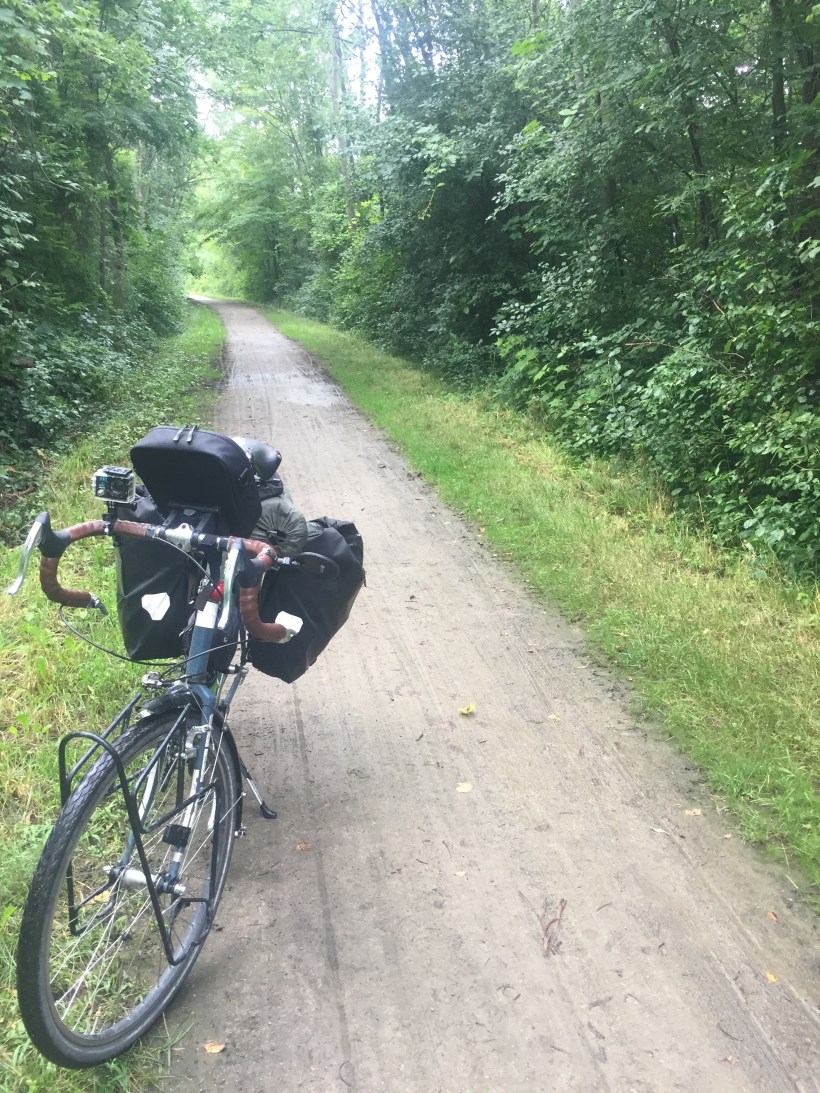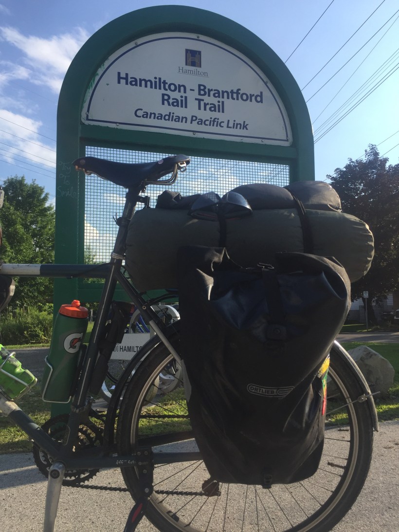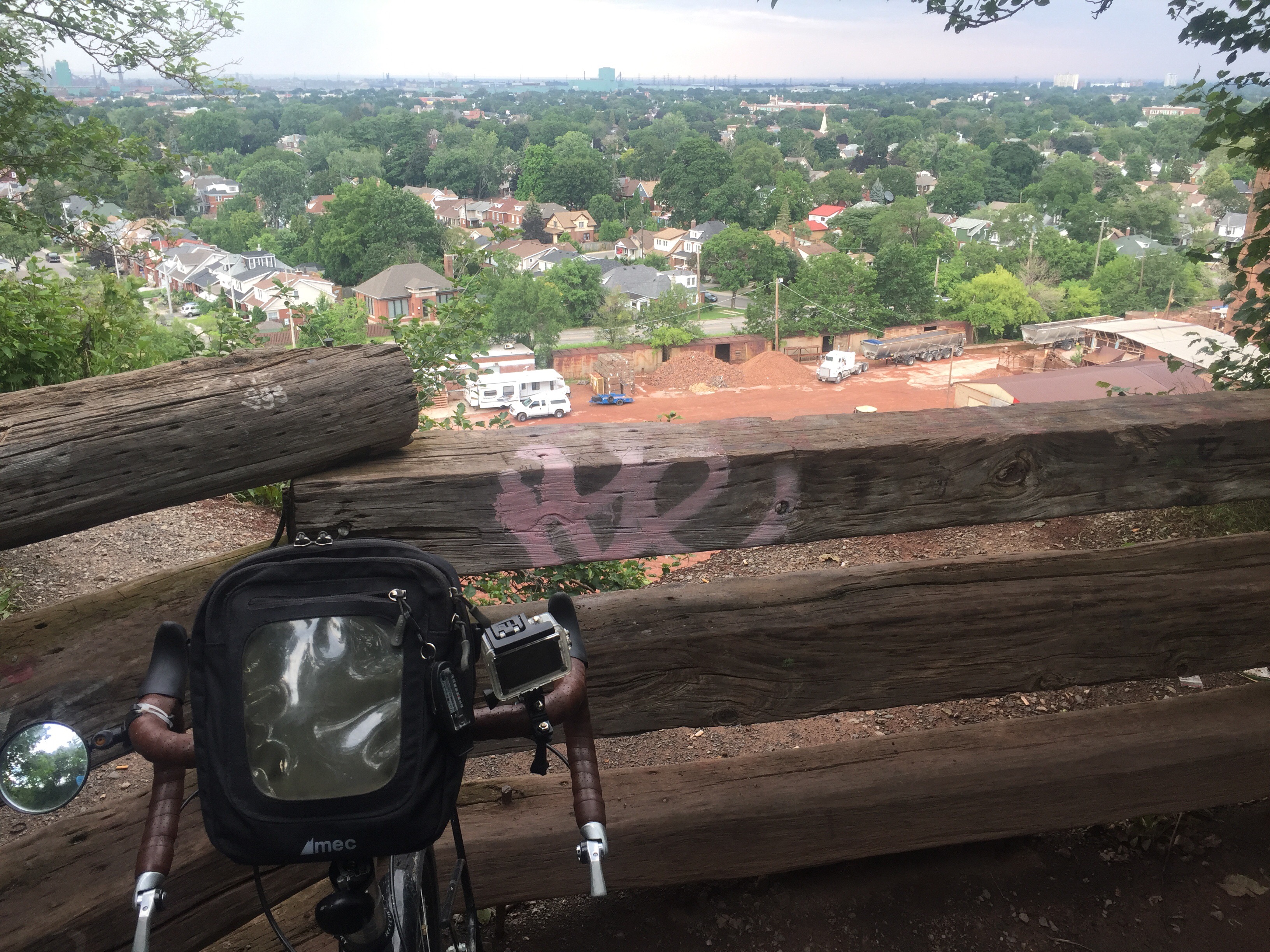 Hamilton – Brantford Rail Trail. Great gravel for riding, surrounded by greenery.Found this view of Hamilton, thanks to a slight detour.