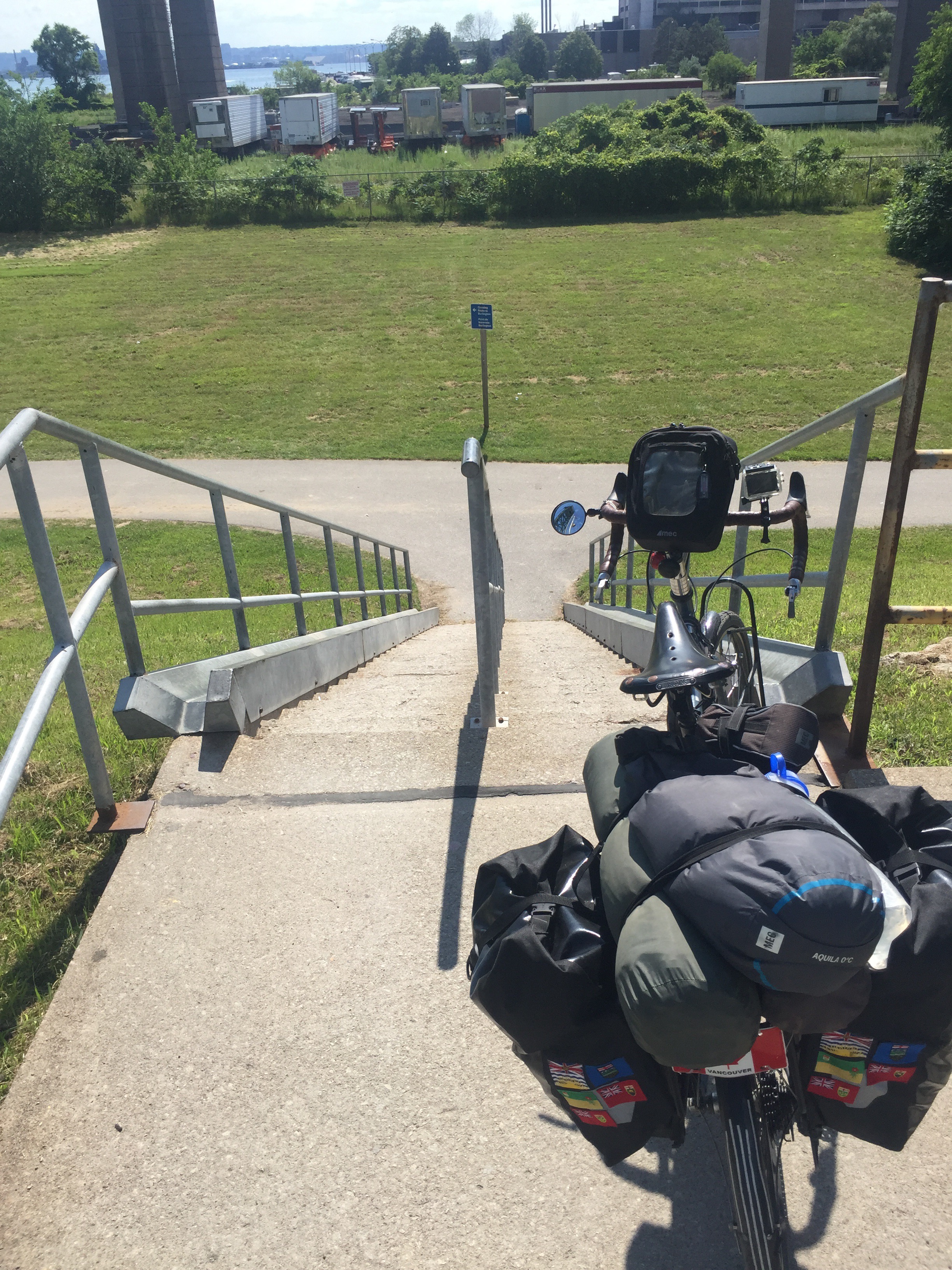 Crossing Queen Elizabeth Way on this pedestrian and cyclist bridge leaving Hamilton. Lift bridge across Lake Ontario from Hamilton to Burlington.View from the lift bridge.A bit tricky getting up and down these stairs with my loaded bike on the lift bridge. I did appreciate the ridge to help wheel down!Small sign for such a big city! I’m sure there’s a bigger one though, I didn’t enter on a major highway.