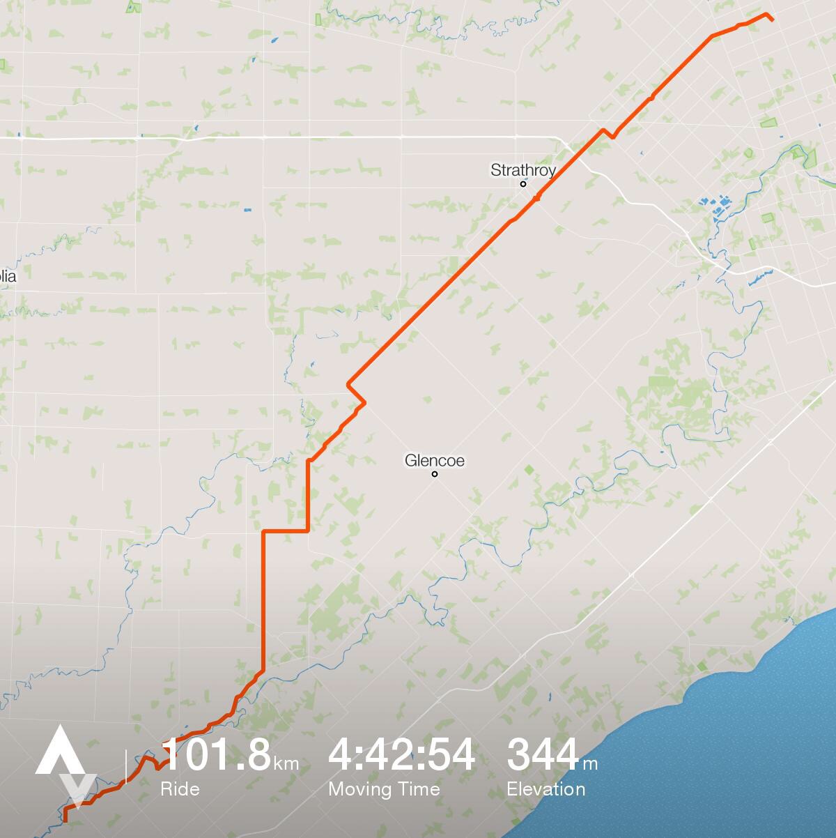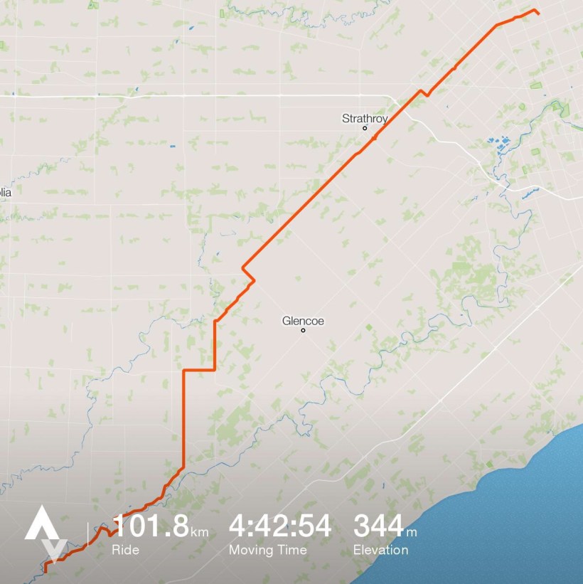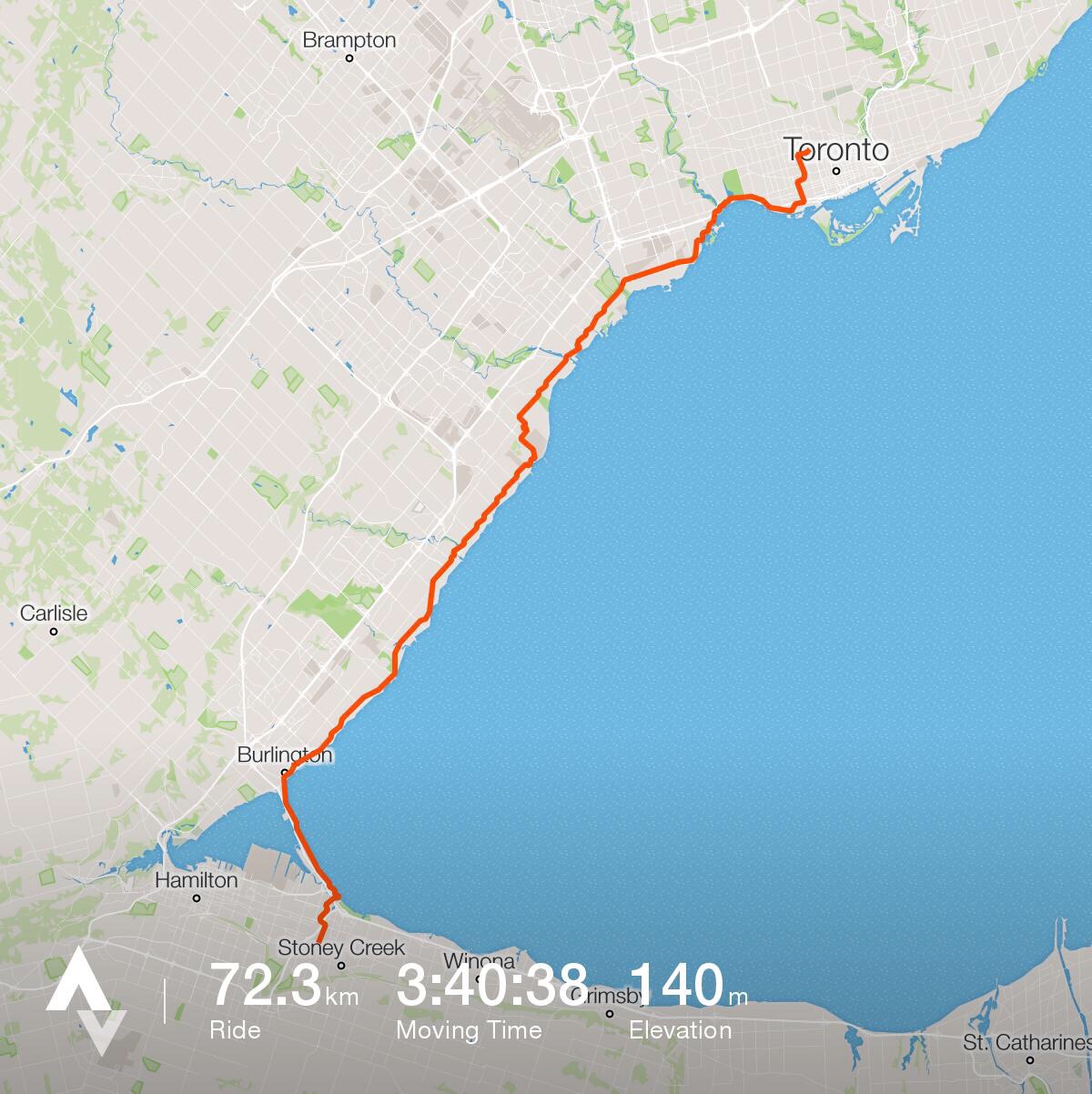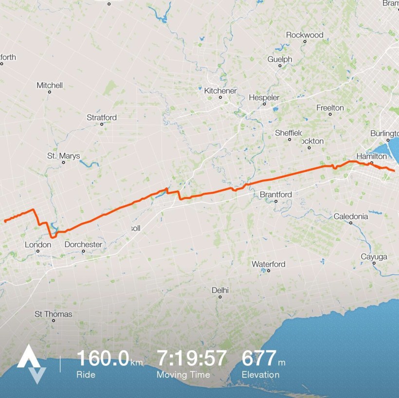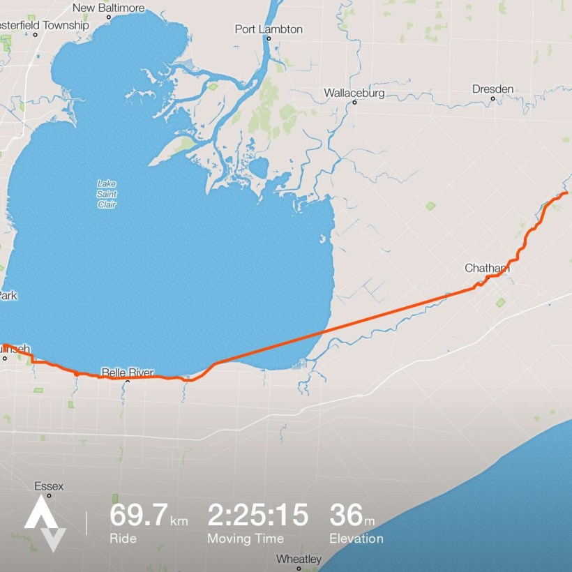 July 25 – Windsor to Chatham-Kent. Inaccurate as I think my phone lost its location for a stretch. No, I didn’t cycle across Lake St. Clair!July 26 – Chatham-Kent to Ilderton.July 27 – Ilderton to Hamilton.July 29 – Hamilton to Toronto.
