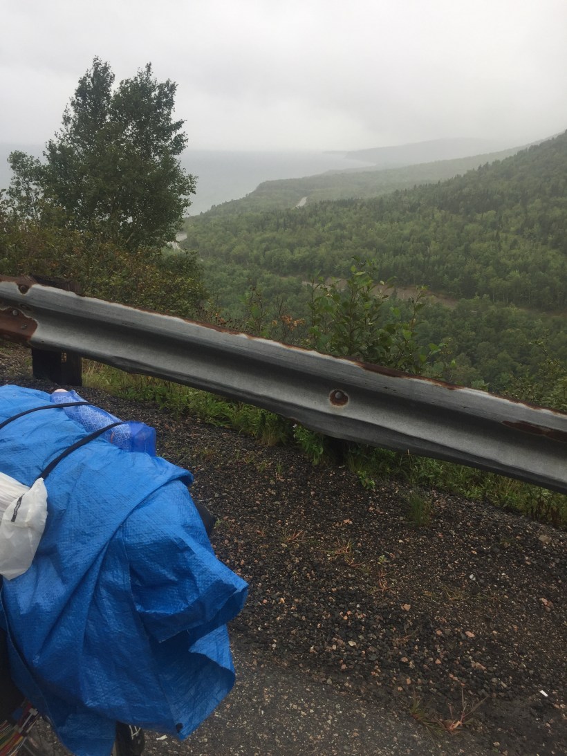 While the Bras d’Or mirrored the sky’s dreary gray and not the royal blue I’d hoped for, the fog thinned that afternoon so my ride did contain many lookouts of the island’s giant oddly shaped lake.