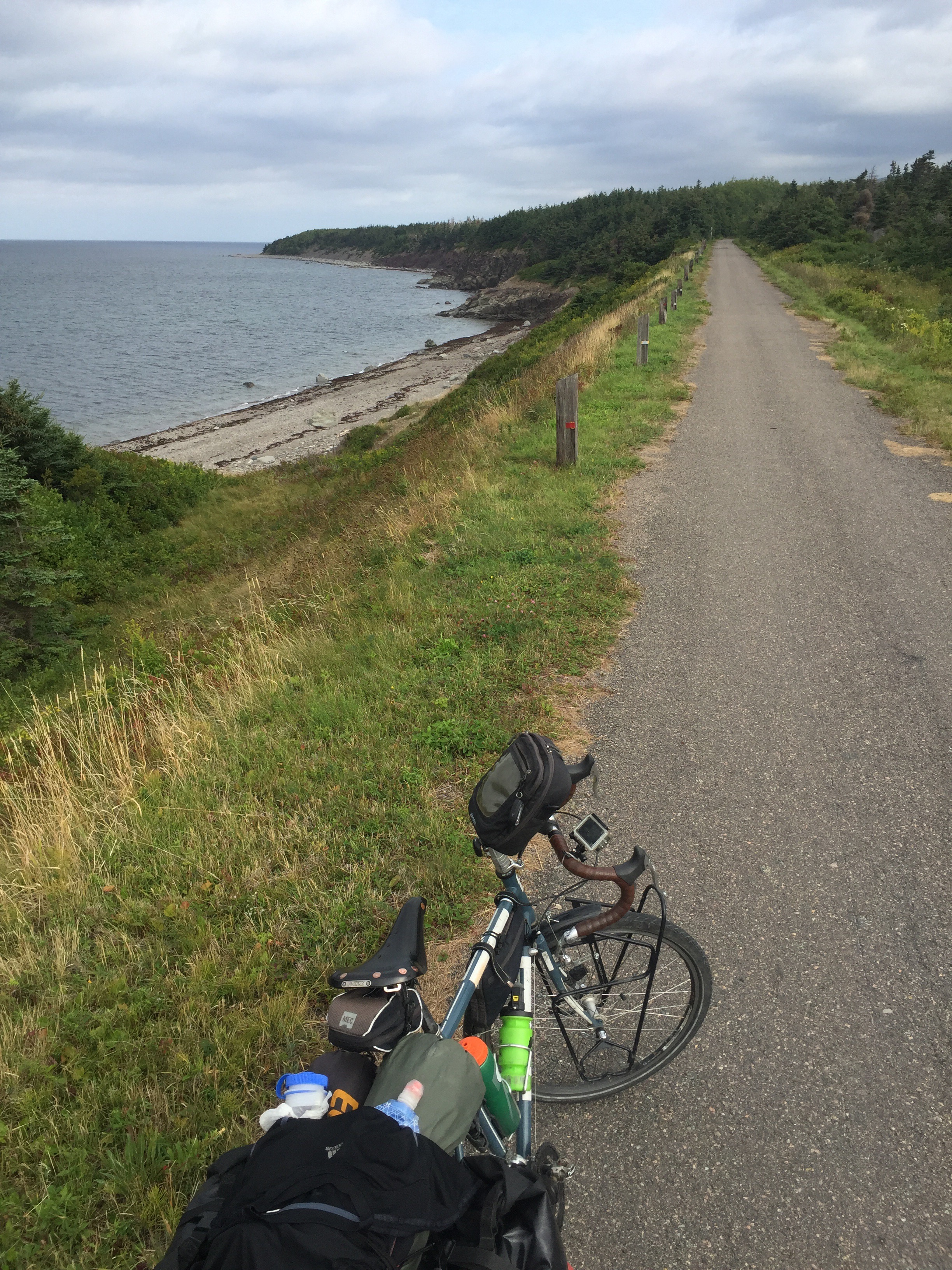 So Wednesday morning I chose the Celtic Shores Trail, yet another former railway section of the Trans Canada Trail. Egged on by mighty tailwind, I struggled through its rocky beginning before enjoying a long stretch of lovely gravel littered with coastline views. Being a rail trail, of course it was quite flat – not to worry, I’d been warned I’d have plenty of climbing on the Cabot Trail ahead!