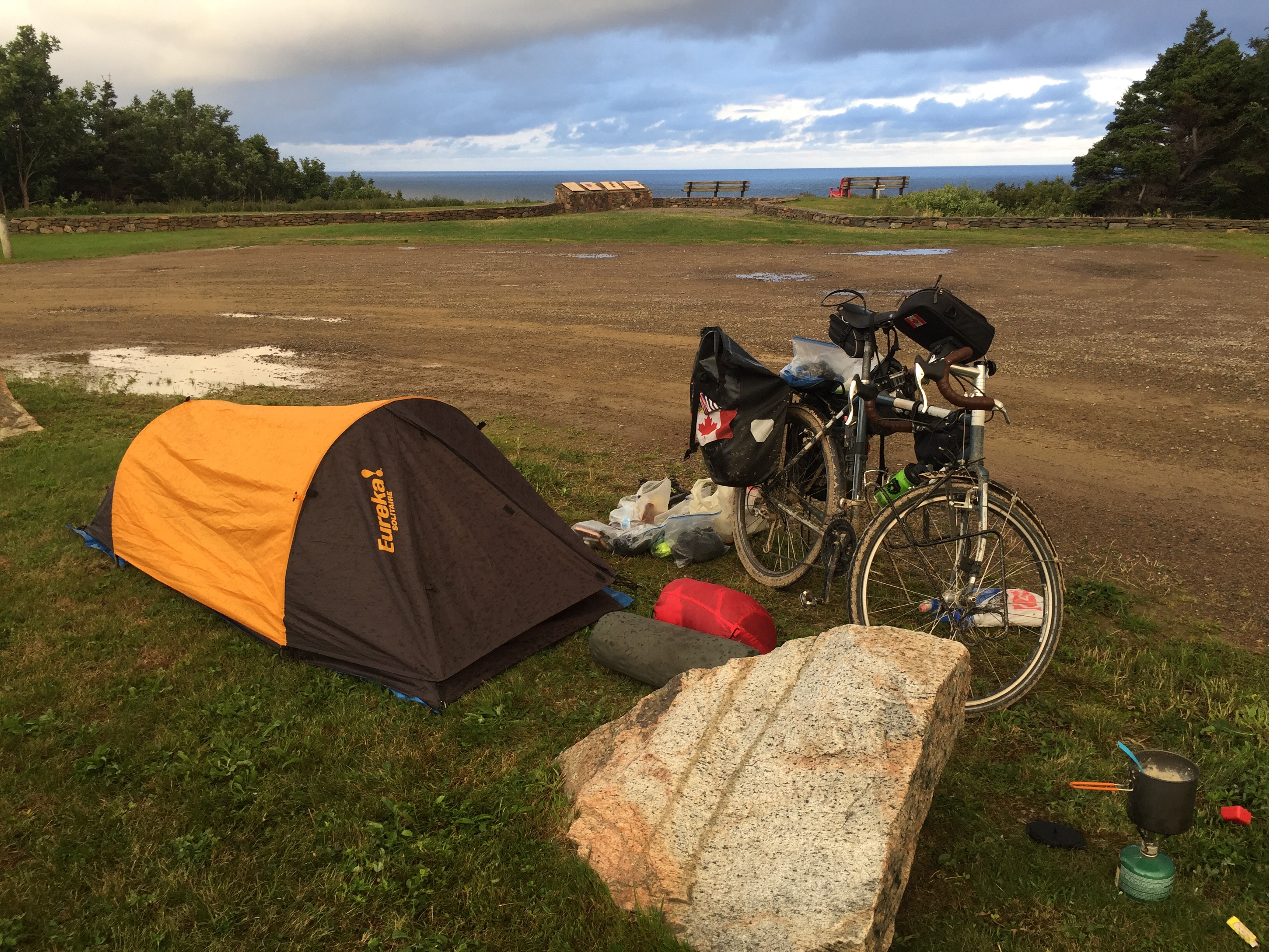 There at precisely 5:27pm I met Phil, Andy, and Ben, about to cycle the Cabot Trail counterclockwise as I was, who informed me the Outdoors Store closed early but Home Hardware across the street was open until 5:30. Bolting between traffic for its already closed doors, I must have appeared desperate enough for them to let me in. Strolling back out seconds later with my brand spankin’ new $30 sleeping bag, I don’t think I’d sported a bigger grin all trip!