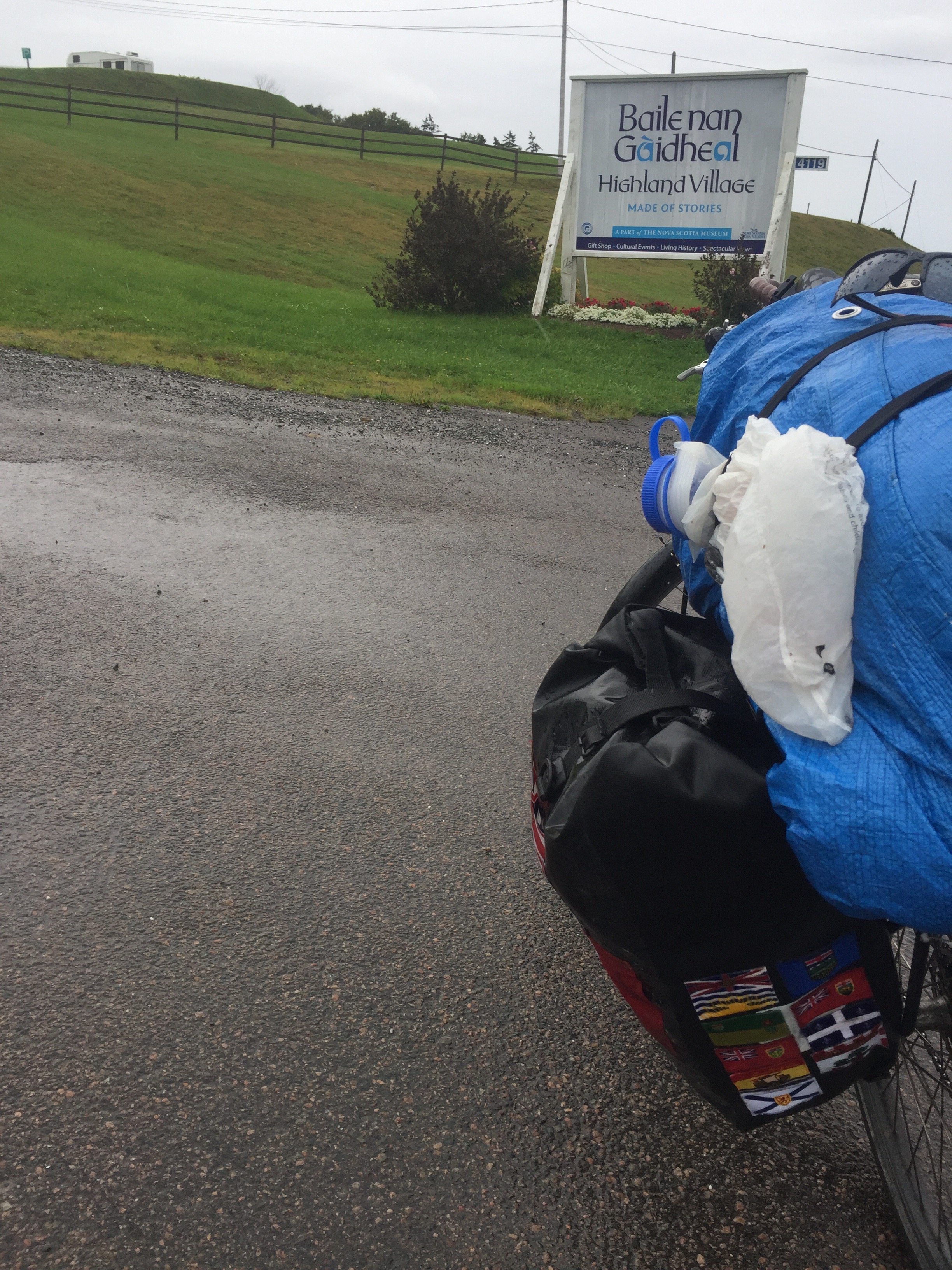 Upon finishing the Cabot Trail loop, my next destination was the North Sydney ferry terminal to complete the province. I opted for a scenic route along the Bras d’Or Lake (which I soon discovered is pronounced like the end of “labrador” and not “brass door”), which would also facilitate a visit to the Highland Village Museum. Monday morning’s downpour motivated hasty pedalling to the comforting, warm museum via a very short Little Narrows ferry.